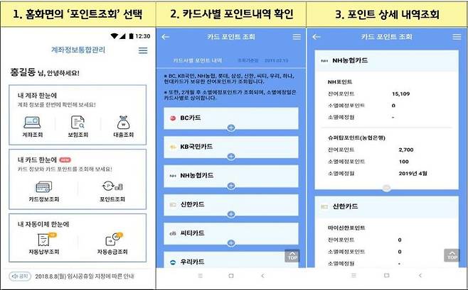"내 카드 한눈에" 서비스는 기존 "내 계좌 한눈에" 서비스 등을 제공하던 "어카운트인포" 어플리케이션에 새롭게 추가된 서비스로 카드이용 정보 조회는 물론이며, 보유하고 있는 카드에 적립된 포인트까지 확인 할 수 있습니다.