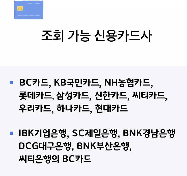 아래 조회 가능 신용카드사의 목록이 있으니 가지고 계신 카드의 조회 가능 여부를 미리 확인해보시길 바랍니다.