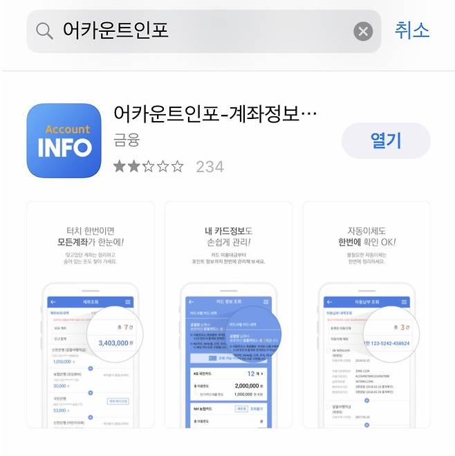 휴대폰의 어플리케이션 스토어에서 "어카운트인포" 검색 후, 설치해주세요.