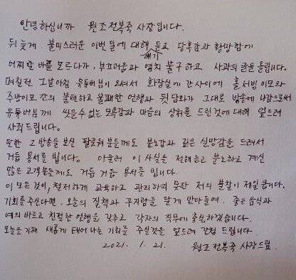 자필로 쓰여진 사과문에는 “뒤늦게 불미스러운 이번 일에 대해 얘기 듣고 당혹감과 황망함에 어찌할 바를 모르다가, 부끄러움과 염치 불구하고 사과의 글을 올린다”고 글을 시작했다.