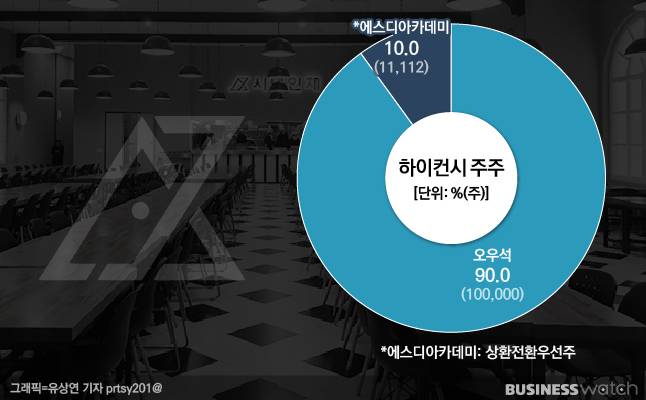 하이컨시는 2019년 6월 사모투자펀드(PEF) 에스디아카데미를 대상으로 상환전환우선주 1만1112주를 발행했다. 에스디아카데미가 지분 10%를 보유한 이유다. 당시 주당발행가는 180배수(액면가 5000원)인 90만원. 하이컨시가 조달한 자금이 100억원이다.