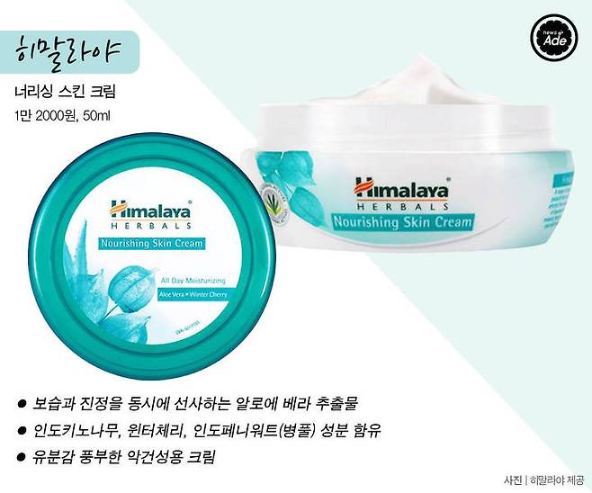 히말라야의 너리싱 크림도 베스트셀러 중 하나다. 유분감 풍부해 오랜 보습감을 선사하지만, 끈적하거나 미끌거리지 않아 폭넓은 연령대에서 인기가 높다.