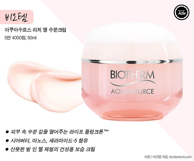 비오템의 아쿠아수르스도 오랜 기간 베스트셀러로 손꼽힌다. 피부 상태에 따른 4가지 텍스처로 출시돼 선택의 폭이 넓다.