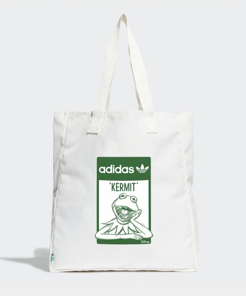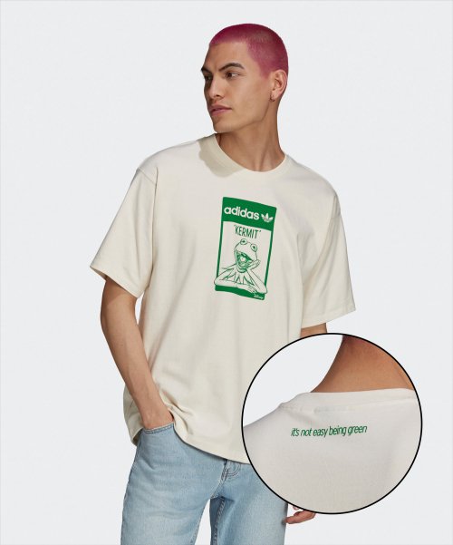 아디다스의 클래식 스니커즈, 스탠스미스에서 영감을 얻은 설포 라벨 로고, 디즈니의 귀여운 개구리 캐릭터 커밋 그래픽을 넣은 반소매 티셔츠입니다.