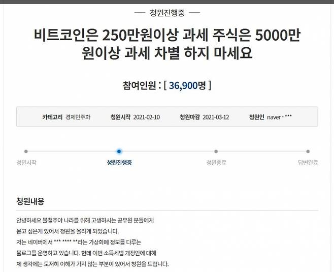 청원인은 해당글에서 "2023년부터 주식투자이익은 5000만원이 넘을 경우 20%의 과세가 부과되는데 왜 비트코인(가상자산)은 250만원이 넘을 경우 20%의 과세를 하냐"며 "왜 세금을 내는 데에 차별을 두는지 묻고싶다"고 적었다. 그러면서 "주식투자자에 비해 인원이 적어 목소리를 못 내니까 세금을 왕창 걷으려는 것이냐"고 덧붙였다.
