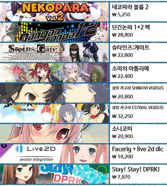 최근 들어 일본 미연시들이 스팀에 업로드되기 시작했습니다. 발매 연도를 가리지 않고 인기작들이 업로드되고 있는 추세며. '케모노 프랜즈' '유녀전기'를 비롯한 신작 애니메이션들도 스트리밍 서비스를 시작하고 있습니다. (다만 한국은 차단된 상태입니다.)