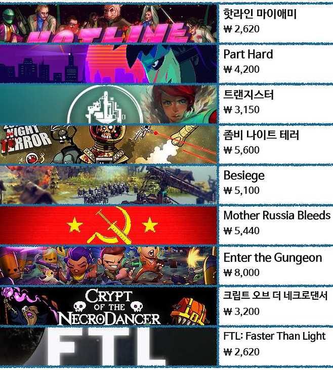 스팀 장터에서 스킨을 팔아 번 돈으로, 혹은 게임을 사고 남은 잔금으로 사기에 최적의 게임들입니다. 가격은 싸지만, 다른 게임들과 비교해도 꿇릴 것 없는 게임성을 보여줍니다. 싼 가격에 부담 없이 즐기기엔 이만한 게임이 없죠.