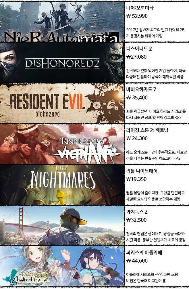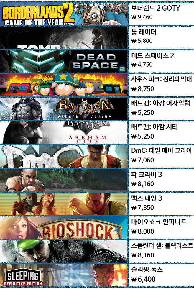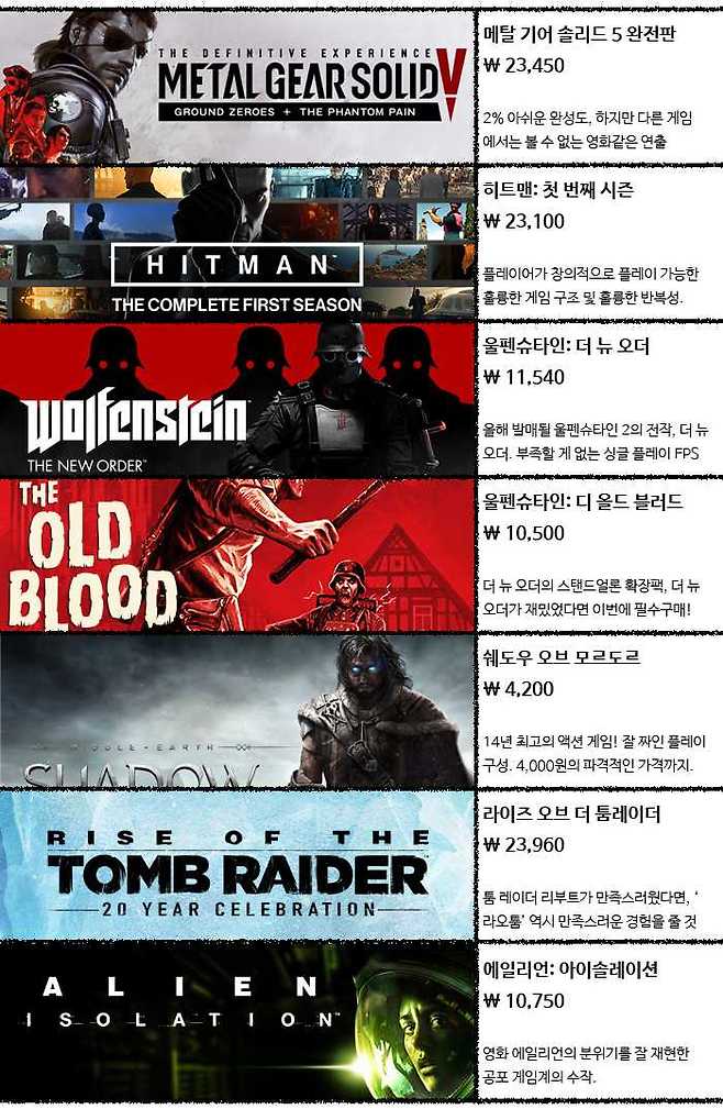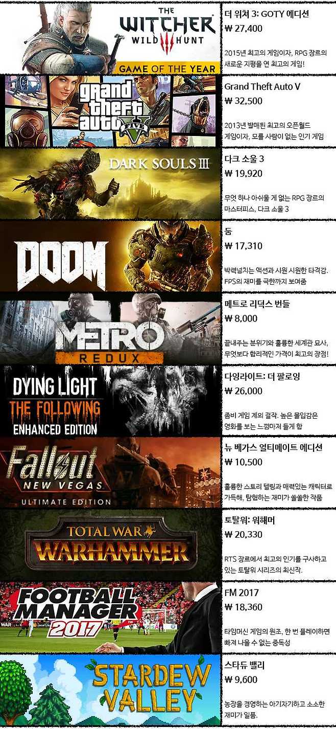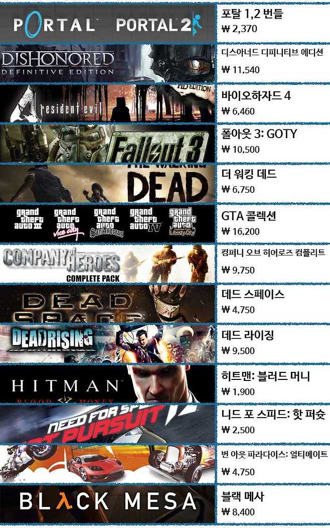 언제 어느 때나 즐겨도 재미있고, 돈값을 하는 최고의 게임들! 세일 기간 동안 리스트 중의 게임 하나만 구매하더라도, 다음 세일 기간 동안 후회 없이 즐길 수 있는 게임들! 구태여 자세히 설명할 필요가 없을 정도로 인기 작품들!