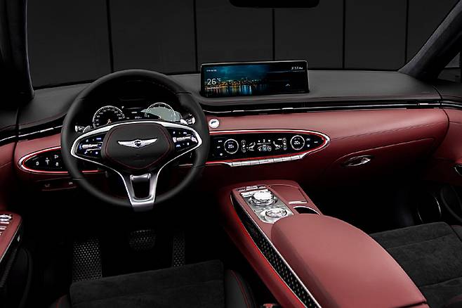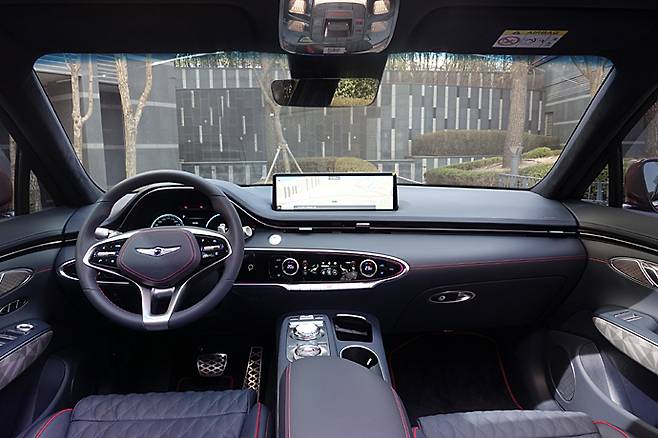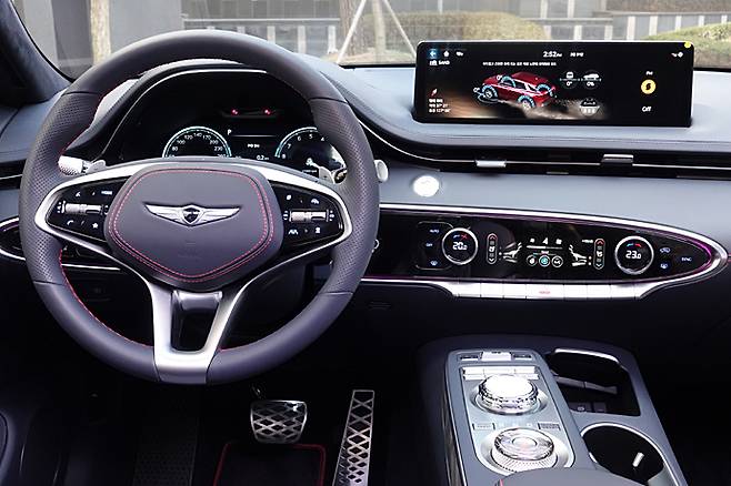 G80에서부터 채용한 대시보드 위의 14.5인치 대형 LCD 터치스크린은 상급 모델과 마찬가지다. 실제 운전석에 앉아 보면 그로 인해 시야가 답답하다거나 과장되어 보이지 않는 것이 특징이다. 이 디스플레이의 배치로 전체적인 분위기가 여유로워졌다. 거기에 GV70은 타원형의 선을 다용한 것도 질감을 높이는 데 일조한다. 풀 디지털 콕핏이지만 여전히 센터페시아 아래쪽에는 에어컨 컨트롤 패널 아래에 자주 사용하는 버튼이 배치되어 있다. 스마트폰 무선 충전 패드는 이제는 당연한 장비다.