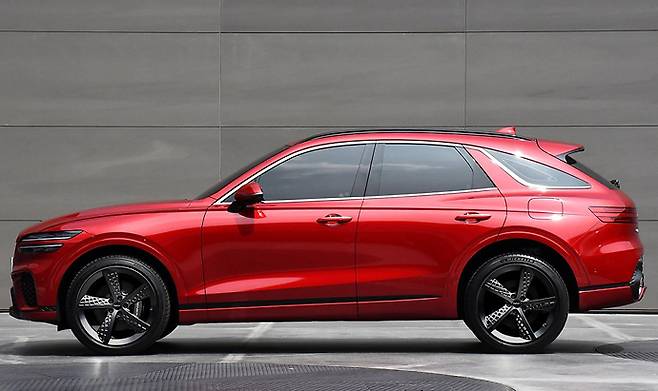 측면에서는 상급 모델인 GV80과 프로포션은 차이가 나지 않지만, 루프라인이 좀 더 쿠페라이크하게 처리되어 있다. 앞쪽으로 강하게 향하고 좁은 삼각형 창을 구성하는 C 필러와 D필러가 인상적이다. 루프 끝부분의 스포일러로 스포티함을 강조하고 있다. 헤드램프 안쪽 킅에서 시작해 사이드미러 아래를 지나 테일램프로 이어지는 아치형 캐릭터 라인이 그런 이미지를 더 강조하고 있다. 휠 하우스도 차체에 비해 크게 처리해 당당한 자세를 만들고 있다.