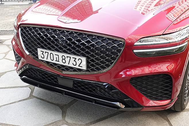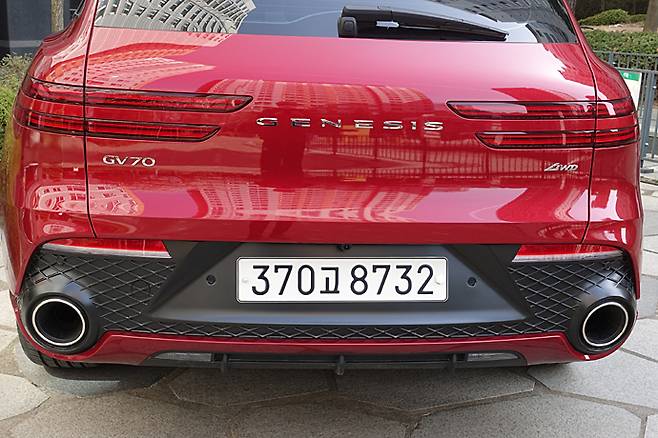 뒤쪽의 디테일은 GV80과는 아주 다르다. 헤치게이트 중간에 크롬도금 바를 사용하거나 테일램프를 연결하지 않는 것은 같은데 각이 없다. 아래쪽에도 범퍼가 없는 듯한 그래픽으로 그곳에 그릴과 같은 G메트릭스 패턴을 적용하고 있다. 트림에 따라 크롬 배기파이프의 그래픽이 다르다. 시승차는 ‘스포츠’로 커다란 원형이 좌우에 배치되어 있다. 배기파이프를 숨기는 오늘날의 트렌드를 역으로 강조하고 있다. 디퓨저 요소가 있는 에이프런도 눈길을 끄는 디테일이다.