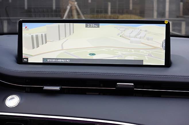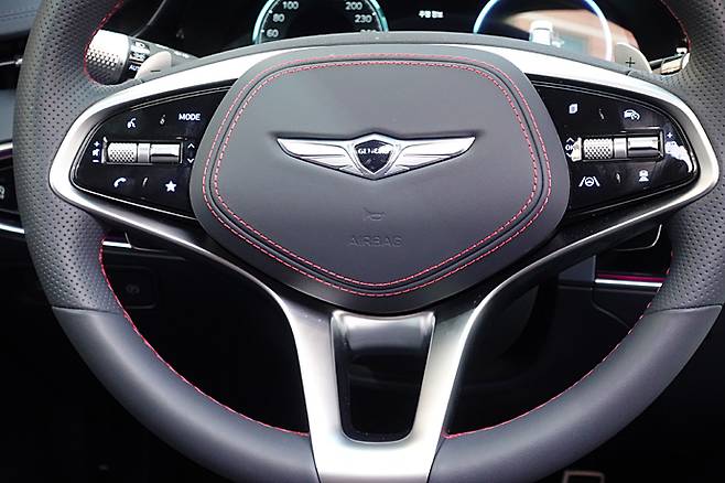 시승차는 타원형 2스포크가 아닌 3스포크 스티어링 휠로 스포티함을 주장하고 있다. 패드도 타원형이지만 좌우 스포크상의 버튼은 다른 모델과 같다. 그 안으로 보이는 풀 디지털 계기판도 기본적으로는 다른 모델과 같지만, 디테일에서 작지 않은 차이가 있다. 엔진 회전계의 숫자가 세단형과 달리 GV80과 GV70은 바깥에서 안쪽으로 숫자가 커진다. BMW가 먼저 사용했다. 가운데 디스플레이를 통해 제공되는 정보의 내용이 더 많아졌다. 통상 주행 시에는 내 차만 표시되는데 ACC를 작동하면 고속도로 주행보조 작동시 앞 차와 좌우 한 차선의 차들을 인식해 보여 준다.