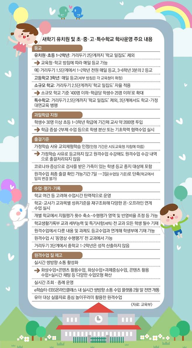 코로나19 ‘3차 대유행’이 진정 국면에 접어들면서 오는 새학기에는 학교라는 일상이 회복될 것이라는 기대감이 커지고 있다. 서울신문은 16일 교육부의 ‘2021학년도 학사 및 교육과정 운영 지원 방안’과 ‘원격수업 및 등교수업 출결·평가·기록 가이드라인’, 서울시교육청의 ‘2021학년도 원격수업 내실화 방안’ 등을 통해 새학기 학교생활을 미리 들여다봤다.