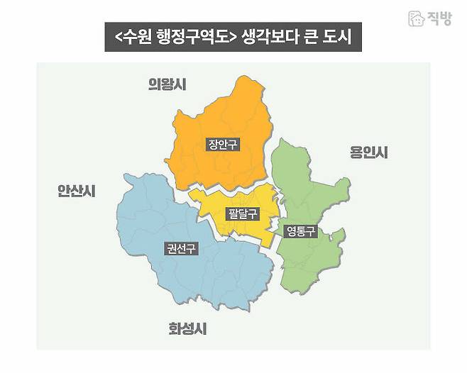 인구 120만 명 수원은 총 4개 구로 구성되어 있다. 장안/팔달과 같이 수원화성 4대문(창룡/화서/팔달/장안)명에서 따온 지명도 있지만, 권선, 영통처럼 새롭게 생겨난 지역도 있다. 이 같은 흐름에서 판단해볼 수 있는 것은 바로 장안/팔달이 구도심이고, 권선/영통이 신도심이라는 점이다. 이중 장안구가 서울에서 가장 가까운 ‘북’쪽에 있으니(북문이 장안문이다) 가장 먼저 가보기로 한다. 지난번에 바라본 의왕과 인접해있기도 하고. 그런데, 이렇게 큰 수원을 한 번에 다 언급하기란 쉽지 않아, 2기 신도시인 광교는 다음에 알아보기로 한다.