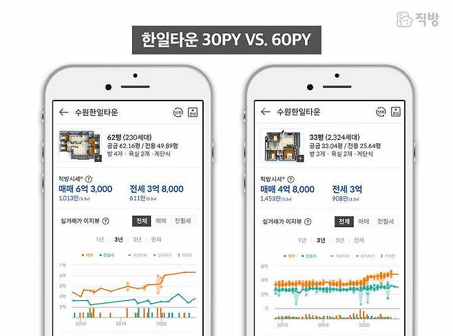 한일타운은 조원동에 위치해 있다. 인근에 경기과학고(학군요소이지만, 막상 관련성은 크게 없다)와 KT위즈파크(야구장), 일왕저수지(만석공원) 등이 있다. 여기에 5천 세대가 넘는 대단지다. 사람들이 선호할만한 입지다. 1999년 준공으로 벌써 준공 21년을 맞이했는데, 전용59㎡ 매매가 4억원(1,600만원/PY), 전용84㎡ 매매가 5억원(1,500만원/PY)이다. 그런데 전용134㎡ 매매가 6.5억원(1,300만원/PY), 전용164㎡ (62PY) 매매가 7억원(1,100만원/PY)은 체감 폭이 크다.