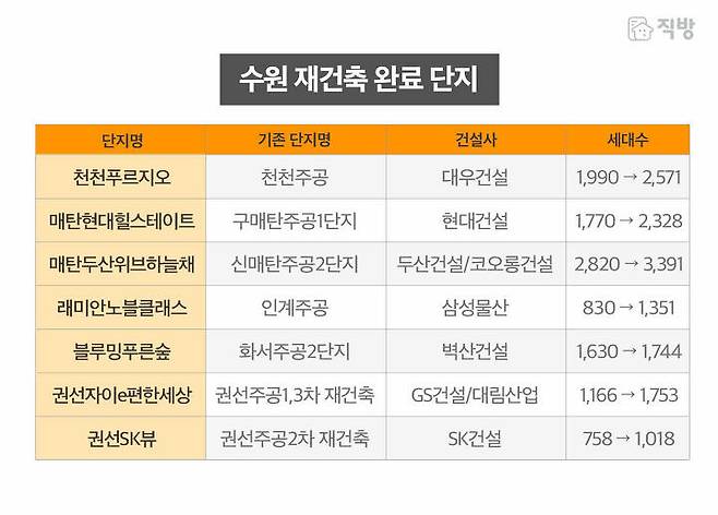 매교역 푸르지오SK뷰(3,603호, 2022년 입주예정) 전용84㎡ 9.3억원(2,700만원/PY), 센트럴아이파크자이(3,432호, 2023년 입주예정), 힐스테이트푸르지오 수원(2,586호, 2022년 입주예정) 전용84㎡ 9.3억원(2,700만원/PY) 등은 재개발 대단지 가격흐름을 전용84㎡ 기준 간단히 10억원을 넘길 수 있는 힘을 보여주고 있다. 아직 입주까지는 2년도 더 남은 상태다. 참고로 고등동 수원역푸르지오자이(4,086호, 2021년 입주예정) 전용84㎡ 매매가 8.7억원(2,500만원/PY)으로, 기존 아파트가격과는 확연한 프리미엄이 확인되고 있다. 그 지역이 어디든.