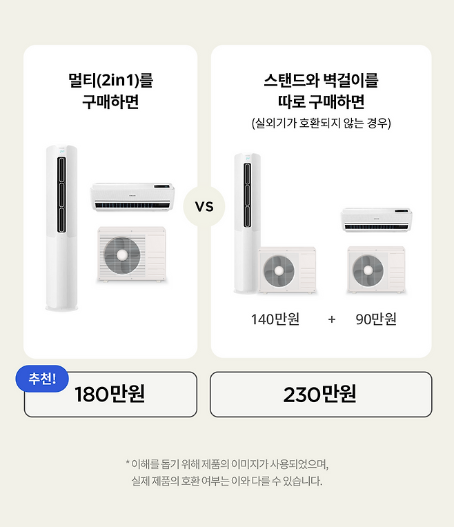 하지만 되도록 처음부터 멀티 제품을 구매하길 추천해요! 스탠드와 벽걸이를 따로 사는 게 오히려 돈도 더 비쌀 뿐더러, 자칫 잘못하면 실외기가 2개가 되는 사태가 생기거든요.