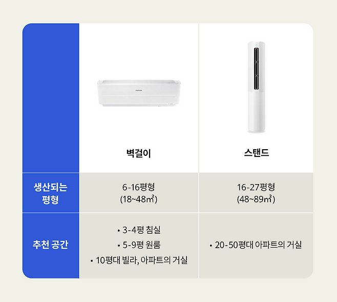 벽걸이냐 스탠드냐는 정하기 쉬워요. 애초에 생산되는 평형 자체가 아래 표처럼 뚜렷하게 나뉘기 때문!