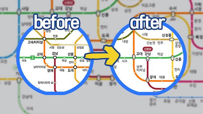 또한 노선도의 모양에도 변화를 줬습니다. 직선 위주의 노선도에 직선과 곡선을 같이 사용해 선만 봐도 어느 방향으로 가는지 알 수 있게 했습니다.