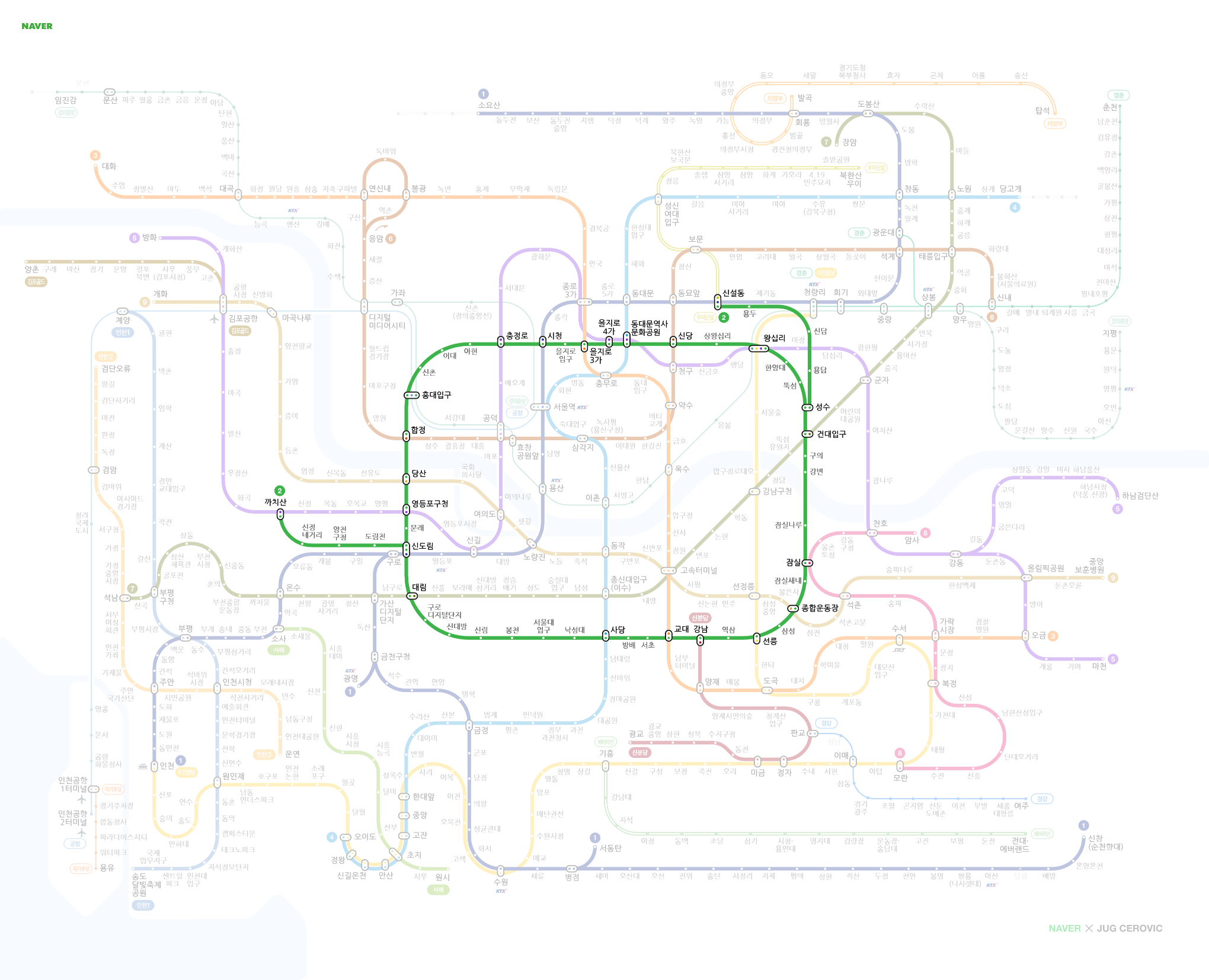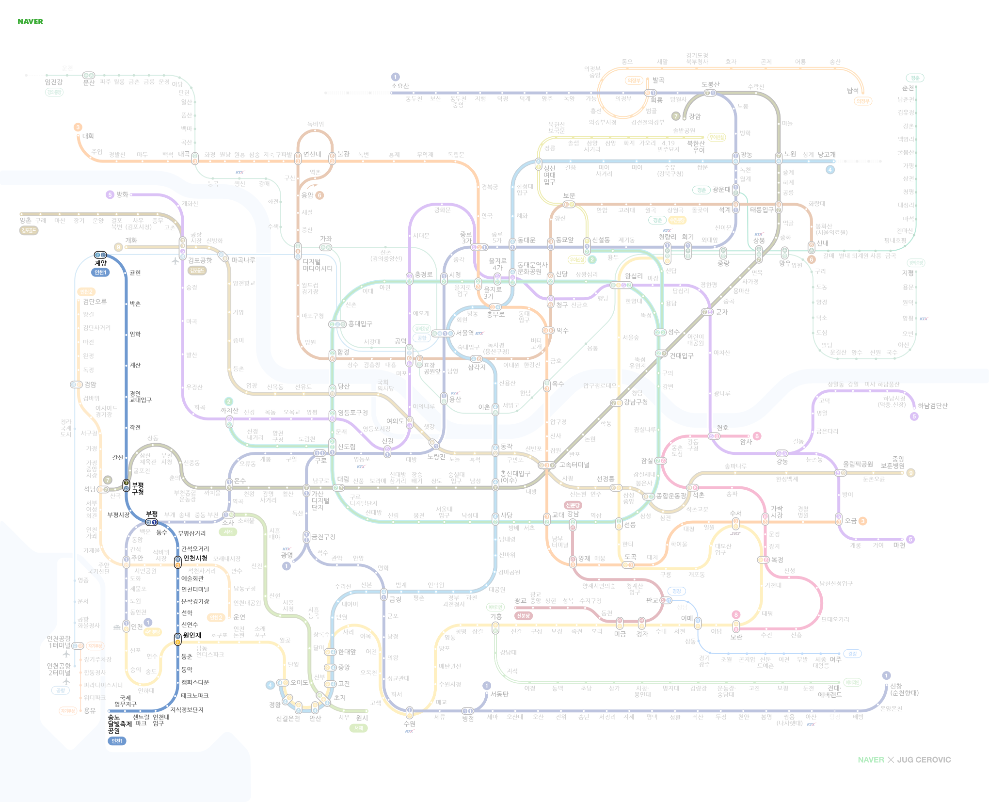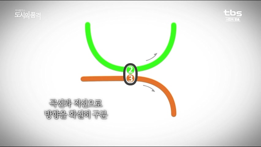 또한 노선도의 모양에도 변화를 줬습니다. 직선 위주의 노선도에 직선과 곡선을 같이 사용해 선만 봐도 어느 방향으로 가는지 알 수 있게 했습니다.