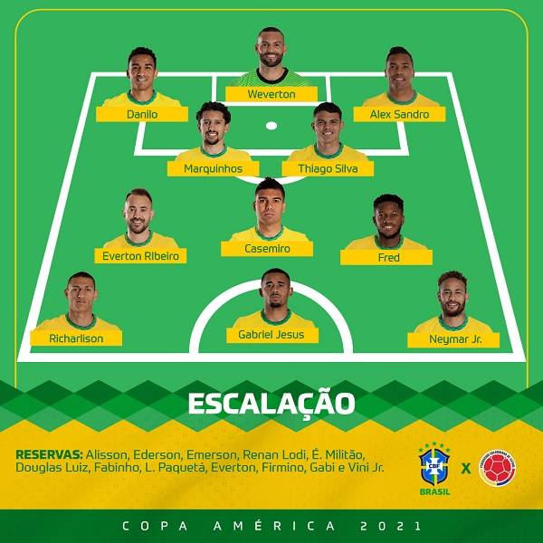 브라질 대표팀은 4-3-3 포메이션으로 콜롬비아전에 나섰다. 제주스와 네이마르 그리고 히샬리송이 스리톱으로 나서면서, 프레드와 카제미루 그리고 에베르통 히베이루가 중원을 지켰다. 포백에는 다닐루와 마르키뉴스 그리고 치아구 시우바와 알렉스 산드루가, 골문은 웨베르통이 수호했다.