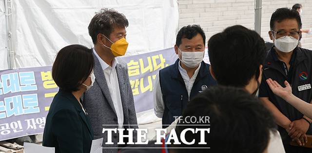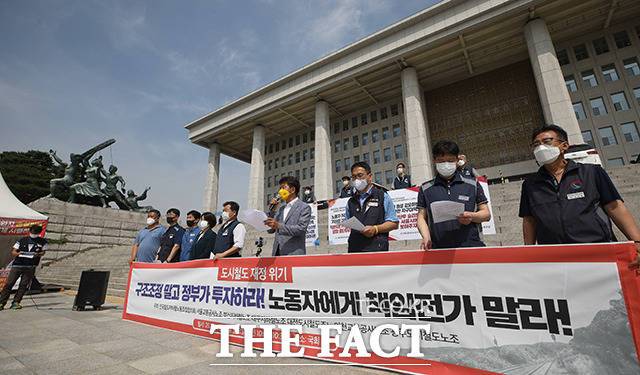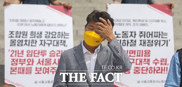 [더팩트ㅣ국회=이선화 기자] 여영국 정의당 대표가 14일 오전 서울 여의도 국회 본청 계단 앞에서 열린 서울교통공사 구조조정 반대 기자회견 '도시철도 재정 위기, 구조조정 말고 정부가 투자하라! 노동자에게 책임전가 말라!'에서 발언을 하고 있다.