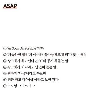 “언제까지 해드릴까요?”라는 질문에는 항상 “아삽이오”라는 답이 돌아온다. 참고로 이 답은 퇴근 직전은 물론이고, 야근 중임은 물론, 새벽에도 울려 퍼진다. 하지만 광고주를 원망할 수도 없다. 그들도 상사에게 아삽을 강요당하기 때문이다. 그래서 때로 광고주와 광고회사는 동질의식을 느낀다.
