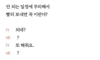 신입 시절에는 어떻게든 광고주가 원하는 일정에 맞춰서 해주는 게 내 능력임을 알았다. 분명 그것은 광고주의 총애를 받게 했다. 문제는 그 총애가 24시간이라는 거다. 그리고 광고주는 나를 전지전능한 아이언맨으로 생각하는지도 모른다. 그렇게 나뿐 아니라 팀원까지도 힘들게 한다. 물론 시간을 못 맞춰준다고 그 고통이 줄어드는 것도 아니다.
