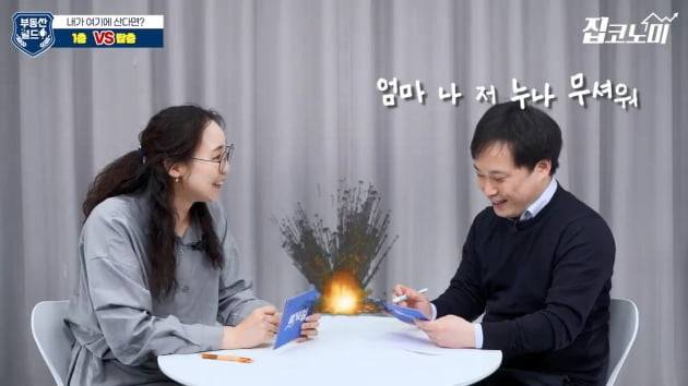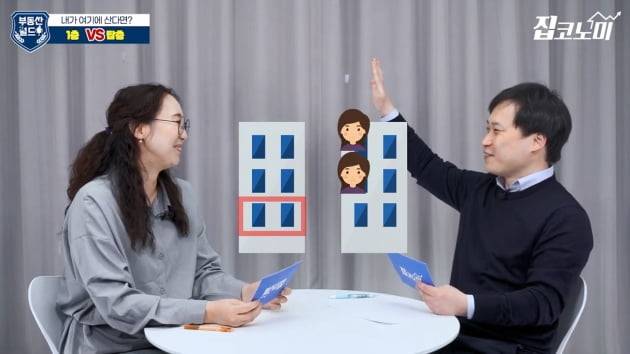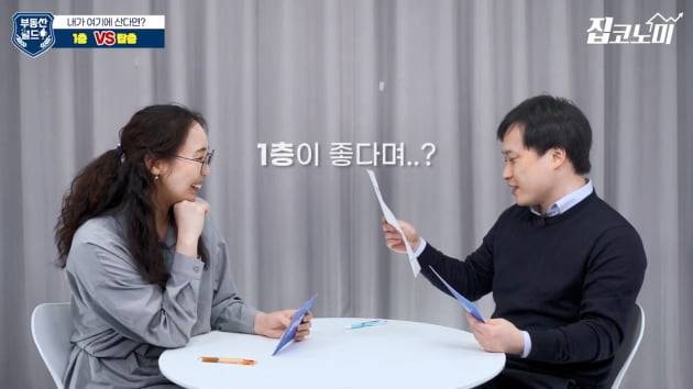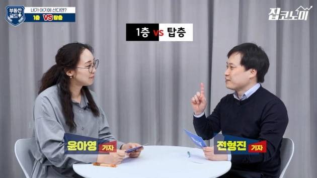 개인이나 가족의 상황에 따라 위치에 대한 가치도 바뀌는데요. 윤아영 기자와 전형진 기자가 이번엔 아파트 선호층을 주제로 본격 콘셉트 대결을 벌였습니다. 윤 기자는 1층, 전 기자는 탑층을 택했습니다.