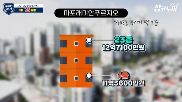 그리고 1층 같은 경우엔 아까 대피하는 거 말씀하셨지만 보안 문제도 있습니다. 우리가 나가는 문으로 도둑들도 거꾸로 들어와요. 그리고 사실 이 얘기까진 꺼내지 않으려고 했는데, 너무 치사해서. 가격의 차이가 심합니다. 1층과 탑층이. 제가 조사를 해봤어요. 마포래미안푸르지오 408동을 기준으로 했습니다. 공시가격 기준으로 1층이 11억3600만원, 꼭대기 층이 23층인데 12억7100만원. 1억4000만원 정도 차이가 나더라고요.