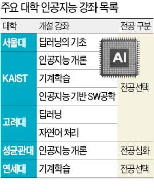 ‘자고 일어나면 달라져 있다’는 말이 나올 정도로 AI 기술의 진화는 가속화하고 있다. 국내 주요 대학 컴퓨터공학과의 전공 구성부터가 그렇다. 대다수가 기초 수준 선택과목으로 AI 수업을 편성하고 있다. 서울대는 올해 1학기 ‘딥러닝의 기초’ 과목을, KAIST는 ‘인공지능개론’ ‘기계학습’ 등을 전공선택으로 개설했다. 고려대 성균관대 연세대 등도 ‘딥러닝’ ‘기계학습’ ‘인공지능개론’ 강좌를 열었다. 다만 개설 과목 수는 대부분 1개에서 3개 정도로 나타났다. AI를 바라보는 ‘관심’의 정도가 드러난 셈이다.