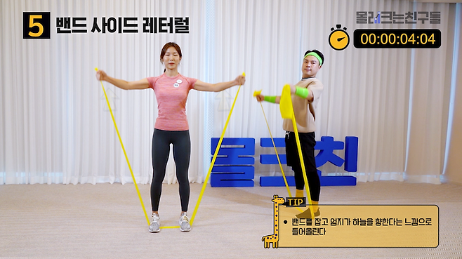 손이 어깨와 수평이 되도록 밴드를 들어올려줍니다.