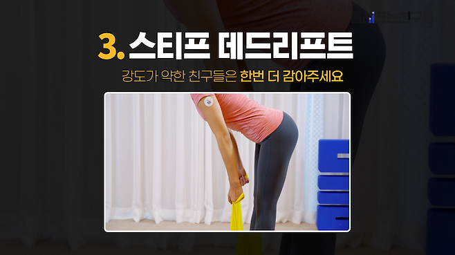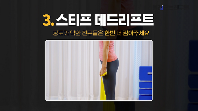 허리를 숙이고 손등이 정면을 보도록 밴드를 잡습니다.