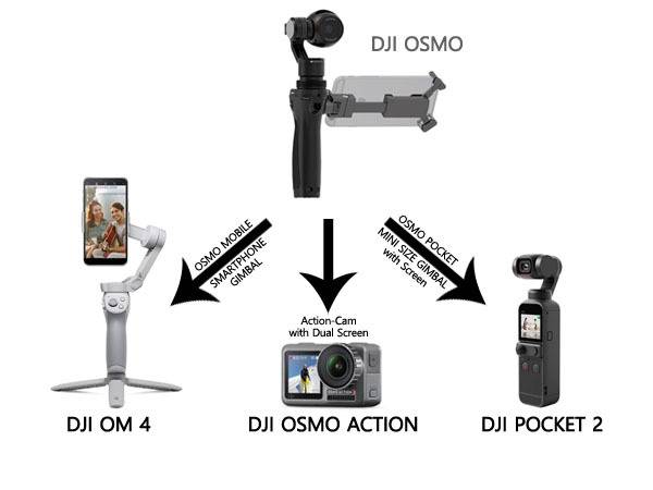 DJI 오즈모(OSMO) 시리즈는 드론(Drone)에 탑재된 카메라 짐벌을 핸드헬드 용도로 만들었는데, 이후 일반 소비자용으로 목적과 기능에 따라 다양한 형태로 분화되었다.