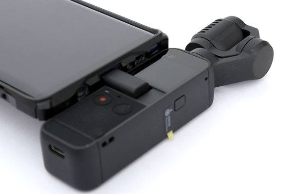 오즈모 액션 같은 제품은 블루투스를 이용해 무선으로 간편하게 기기 연결을 할 수 있으나 DJI 포켓2는 제공되는 스마트폰 어댑터를 써서 유선으로 직접 연결해야 기기 인식과 활성화가 된다는 점이 불편하다.