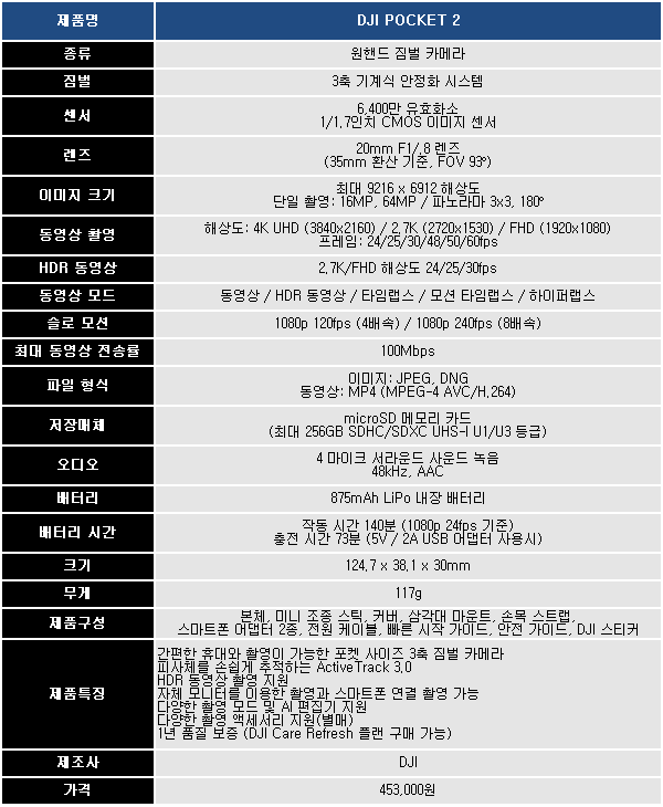 DJI 포켓2는 카메라 짐벌 기능의 유용성을 경험한 사람에게 스마트폰의 간편함과 휴대성, 3축 기계식 짐벌의 탁월한 기능을 동시에 누리를 수 있도록 해주는 제품이다.