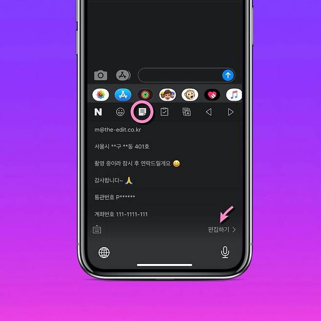 위에서 말한 영문 주소를 번역 기능으로 그때그때 치지 않고 즐겨찾기처럼 등록해두는 방법도 있다. 정말 자주 쓰는데 지독히 안 외워지는 것들이 있기 마련이니까. 혹은 외우고 있어도 타자로 치기 영 까다로운 것도 있지. 예를 들면 디에디트의 내 메일 주소 같은 거 말이다. 사실 아이폰의 설정>키보드> 텍스트대치 메뉴에서 자주 쓰는 문구를 자음으로 등록해둘 수도 있긴 하다. 하지만 스마트보드는 메모장 버튼을 누르면 내가 등록해둔 문구들이 한눈에 보이고 원하는 문구를 탭하면 불러올 수 있으니 더 직관적이다. 스마트 보드를 통해서는 원하는 문구를 최대 200자까지 추가할 수 있다. 만약 등록하고 싶은 문구가 생각나면 편집하기를 통해서 바로 등록할 수 있으니 참고하자.