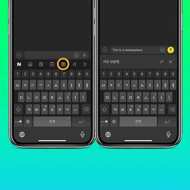 일단 키보드 상단에 번역 아이콘을 클릭한다. 그리고 번역하고 싶은 문장을 타이핑하면 끝! 한 단어를 칠 때마다 파파고가 찰떡같이 알아듣고 실시간으로 번역을 해준다. 파파고의 능력을 시험해보고 싶어 조금 난이도 있는 문장을 준비했다. “이건 갓띵작”이라고 타이핑을 하니 바로 “This is a masterpiece”라고 뜬다.