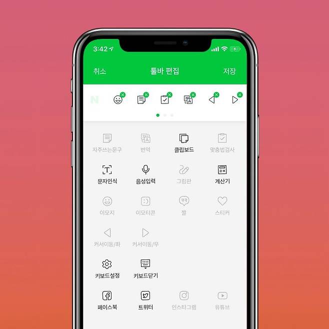 자, 그래서 이렇게 편하게 쓰기 위해서는 네이버 스마트보드 앱에서도 몇 가지 세팅이 필요하다. 물론 개인의 취향에 따라 선택하면 되지만, 일단 위에서 설명한 기능들을 가장 빠르고 효율적으로 사용하기 위한 내 세팅부터 공개한다. 일단 이렇게 해두고, 사용하다가 더 필요하다고 생각한 것은 개인의 입맛에 맞춰 바꿔쓰는 것을 추천한다. 가장 먼저 해야 할 것은 역시 키보드에서 가장 빠르게 접근할 수 있는 툴바 설정. 자주 쓰는 기능들을 제일 첫 줄에 넣어두면 좋다.