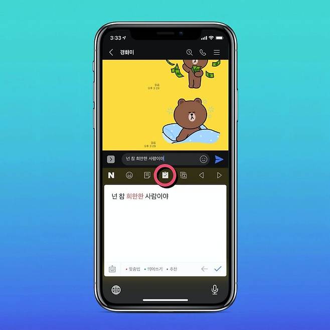 놀라운 건, 키보드에서 맞춤법 검사도 가능하다는 거다. 평생 한글을 써왔지만, 아직도 몇 가지 맞춤법은 쓸 때마다 헷갈린다. 중요한 공지나 직상 상사에게 보내는 메시지는 보내고 나서 아차하는 순간엔 이미 늦은 경우가 많다. 사실 검색 한 번이면 알 수 있지만 막상 귀찮아서 잘 안 하게 되는 경우가 대부분이 아닐까. 보내고 나서 후회하면 이미 늦었다. 어떤 문장이 수상하다 싶으면 맞춤법 검사를 돌려보자.