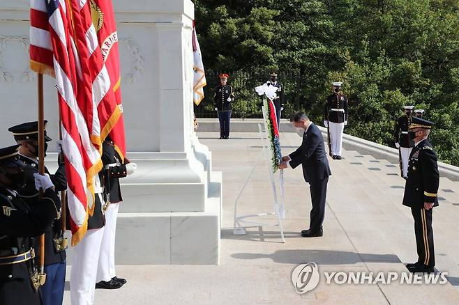 (워싱턴=연합뉴스) 최재구 기자 = 한미정상회담 참석차 미국 워싱턴을 방문중인 문재인 대통령이 20일(현지시간) 워싱턴DC인근 알링턴 국립묘지를 찾아 무명용사의 묘에 헌화하고 있다. 2021.5.20