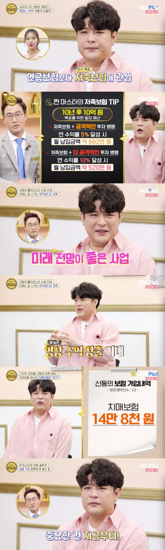 그의 목표는 10억 모으기다. 신동은 “집을 산다는 목표가 생겼다. 10년 뒤에 10억 마련하기. 저축보험으로 가능할까요. 한 달에 500만 원은 낼 수 있다. 그런데 만기까지 내본 적이 없다. 주식도 못한다. 공격적인 투자 성향”이라고 설명했다.
