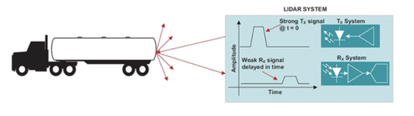 또 LiDAR 기술 작동 원리는 자체와 대상 간의 거리를 측정하는 원격 감지 기술이다. 빛이 LiDAR에서 방출되어 대상으로 이동한 후 표면에서 반사되어 다시 소스로 돌아온다. 빛의 속도는 일정한 값(299,792,58m/s)이므로 LiDAR은 물체까지 거리 계산이 가능하다.