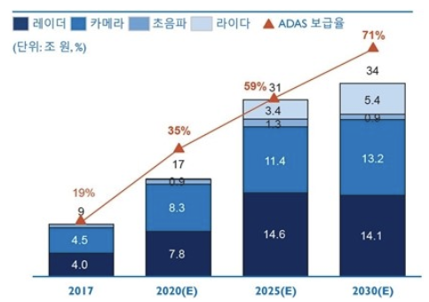 자율주행 자동차의 핵심기술 3가지는 인지, 판단, 제어 3개 분야다. 이중 인지 분야는 정적장애물(가로등, 전봇대 등), 동적 장애물(차량, 보행자 등), 도로표식(차선, 정지선, 횡단보도 등), 신호 등을 인식하는 기술이다. 전체 시장의 약 65% 정도를 차지한다. 인지의 기능이 중요한 만큼 센서들의 중요도도 올라라고 있다.