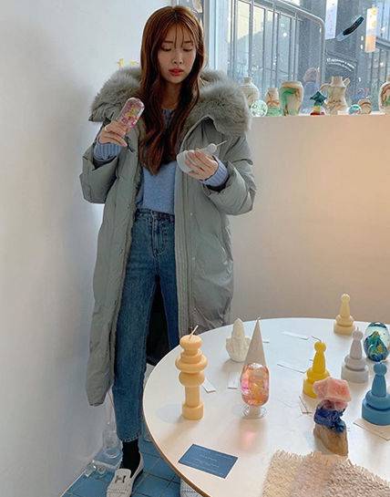 (위) 파스텔 블루 컬러 카디건은 론 헤르만, 롱 패딩은 네파, 가방은 파인드카푸어, 데님 팬츠는 닐바이피