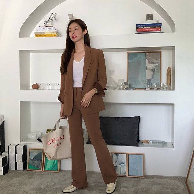 (위) 브라운 컬러 팬츠 수트는 프론트로우, 로퍼는 바이미나, 쇼퍼백은 셀린느