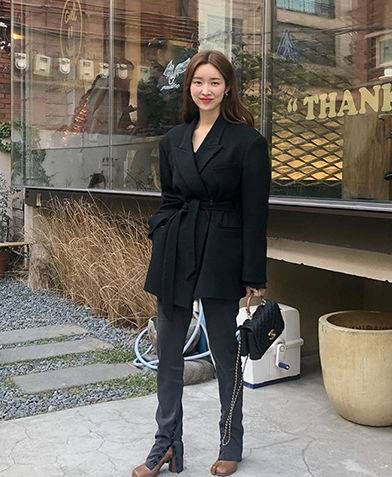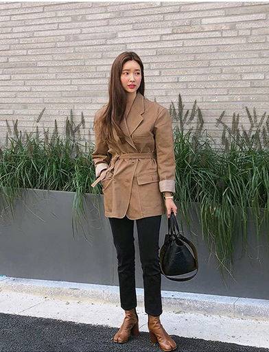 엉덩이를 살짝 덮는 하프 재킷에 긴 팬츠를 입고자 한다면, 허리라인을 살려 입어야 몸매가 부해 보이는 위험을 피할 수 있다. 이너는 차정원처럼 생략한 듯 넥 라인을 과감하게 드러내거나 반대로 몸에 핏되는 터틀넥이 정답. 상의에 벨트나 스트랩이 더해져 있을 때는 크로스 보디 백이나 숄더 백보다는 손에 간단히 들 수 있는 토트백이나 클러치를 선택해야 스타일링이 복잡해 보이지 않는다는 사실도 꼭 기억해 둘 것.
