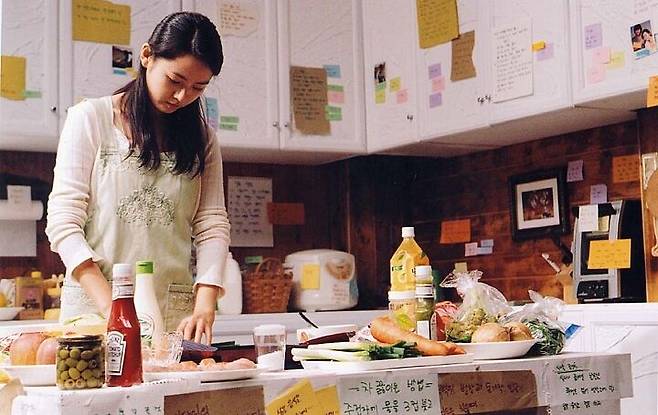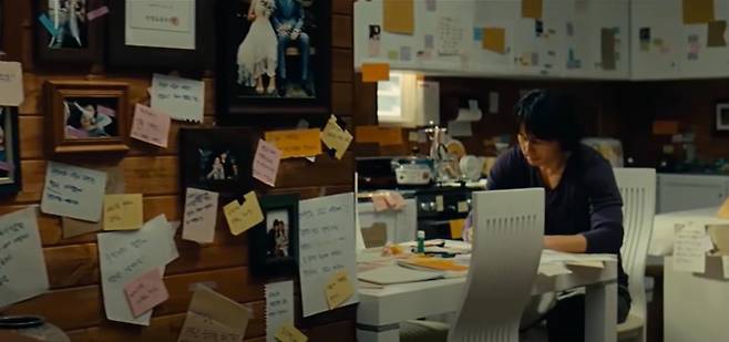 철수가 수진을 위해 부엌을 비롯한 모든 방에 메모지 쪽지들에 글을 쓰며 붙이는 로맨틱한 장면.