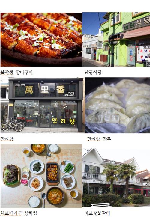 시장횟집은 맞춤요리도 제공하는 향어횟집이다. 화포메기국은 3대를 이어온 곳으로 과거 일대가 화포나루터일 때부터 주막집처럼 술과 음식을 팔았고 유명 인사들이 많이 다녀간 곳이다.