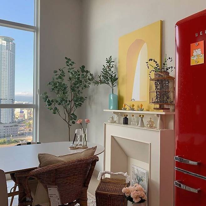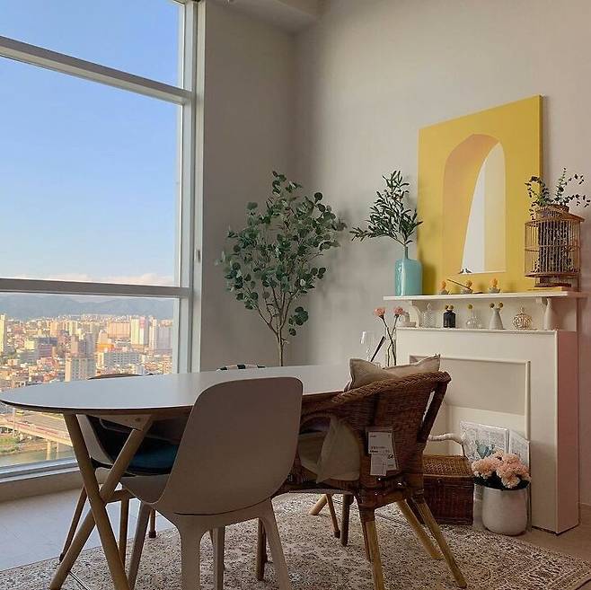 벽난로 : 브릭나인 인테리어 벽난로 / 라탄의자 : 이케아 AGEN 아겐 의자 / 의자 : 이케아 ODGER 오드게르 의자 / 액자 : MINIMO 노란창문 캔버스 액자 / 러그 : 바이빔 페르시안 잔드 사각 카페트 / 테이블 : 이케아 테이블 : 이케아 SLÄHULT 슬레훌트 테이블, DALSHULT 달스훌트 하부프레임